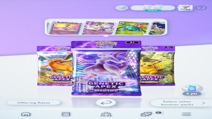 The game features a solid rewarding tutorial that breaks everything down step-by-step, making it easy to follow and perfect for players of all ages. Right from the start, you dive into opening booster packs, choosing between Mewtwo, Pikachu, or Charizard Genetic Apex packs—each providing unique Pokémon and Trainer cards with five cards per pack. This setup makes collecting and the randomness more manageable, making it easier to get the cards you need.