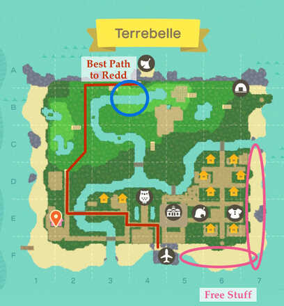 OK, gates open again! Heavy Meteor shower here! Celeste is roped off in location indicated in blue. Redd is here with: Microscope (black), Champion’s Pennant (blue). Best path to Redd on map below. Free stuff (including fruit and shells) on SE beach (pink). Feel free to shop/wish/explore. Everyone is invited. Dodo code: 78LKL Please be careful of my flowers and weeds :)