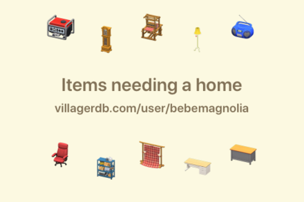 Created a list of diys and some items needing a home. https://villagerdb.com/user/bebemagnolia/list/items-needing-a-home#image-maker