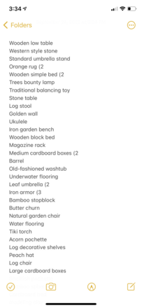 Does anyone need these diys? Shell rug, jungle flooring, bamboo sphere, golden arowana model, rustic-stone wall, wooden simple bed, pine bonsai tree, sandy-beach flooring, wooden fish, gold-screen wall, wooden-knot wall, tree's bounty little tree, pot, grass standee, woodland wall, knitted-grass backpack, outdoor bath, bamboo flooring, corral fence, iron armor, bamboo wall, stone tablet, bamboo wall decoration, tiny library, pitfall seed, knight's helmet, document stack, cherry hat, grass skirt
