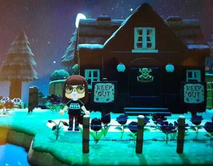My 5 star WIP island, Aniville, has a haunted house (Halloween is less than 100 days away!), a 90s Hot Topic basement, and a Dunkin Donuts by a pretty cool barcade - be sure to check out the TVs there (to your immediate right from where you wake up) to catch a fun surprise broadcast at 3:33am (a couple of minutes if this works) (Would love to visit a spooky, gothy, creepy, rockin' island if you got 'em!) DA-3944-5250-2664