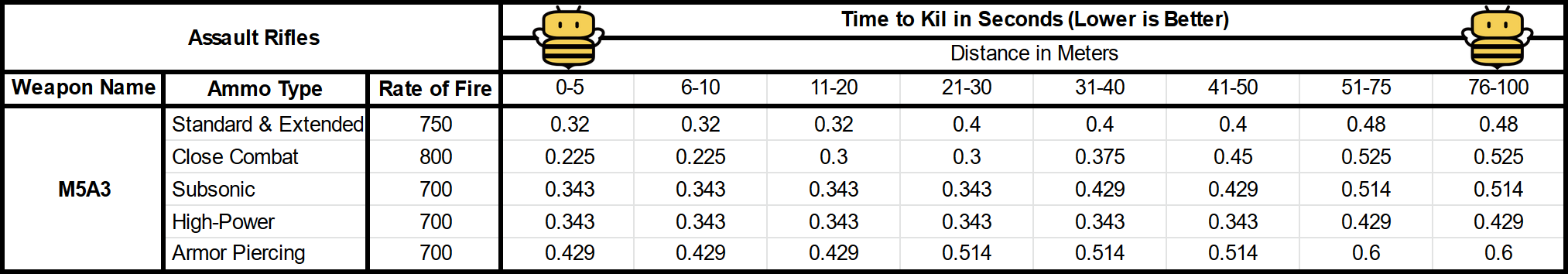 The TTK was computed by using the following formula: (60/Rate of Fire)*(BTK-1).