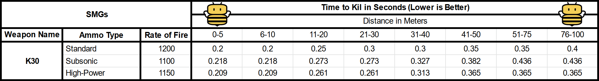 The TTK was computed by using the following formula: (60/Rate of Fire)*(BTK-1).