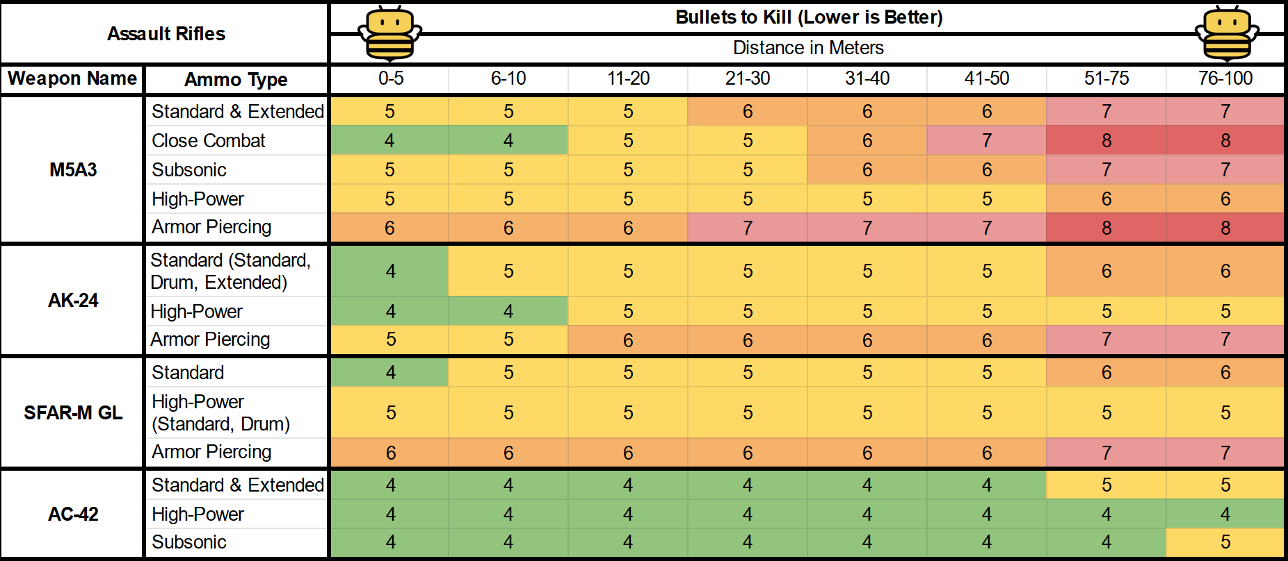 Hi. Great job but your numbers aren't correct. There is no difference between 0-5 and 0-9 m. distance. Correct numbers for almost all meta weapons you can find here. Made for personal use, but feel free to read =) https://docs.google.com/spreadsheets/d/1zgCGWRj4lN0BNzTAB9BnQ4pMbw7RZ-eyxZwDAWU95i8