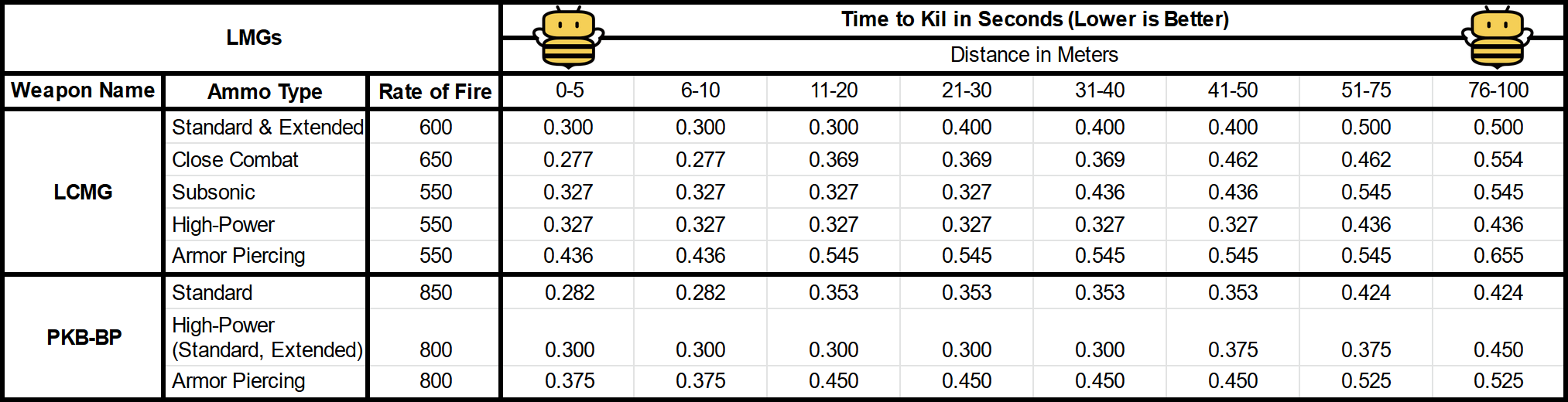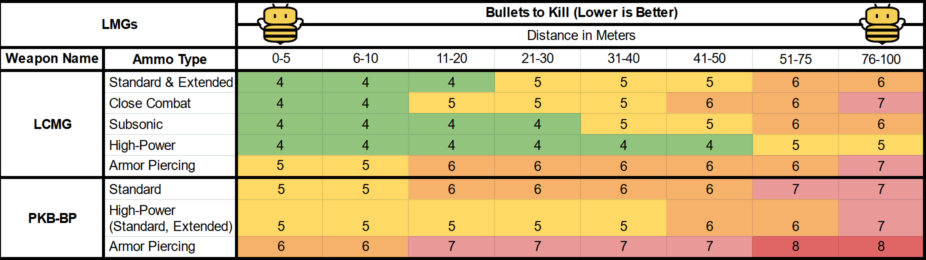 The LCMG boasts the best BTK compared to the PKB BP for all ranges. What's surprising is how the Subsonic ammo type beats the Close Combat and Standard Magazine for close to mid ranges. This makes the ammo type viable, especially since it will attract less attention with the removal of bullet tracers.