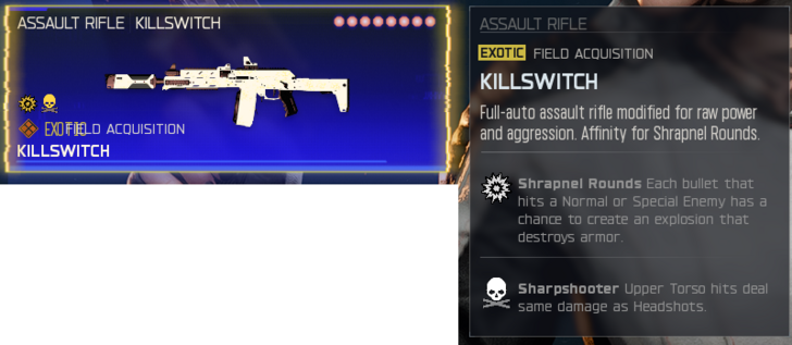 Hi! I got this assault riffle, Killswitch that is not on the list. Would be great if the site could say which weapon the Exotic is from. For example the Overcharge is the M10 Breacher; Ghost Mind is the VS Recon, etc. Because the kills of the exotic also count for the camos.