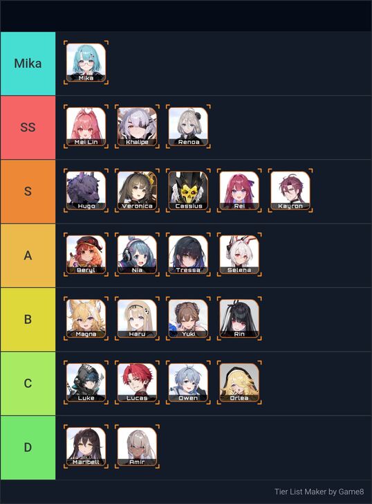 Base on own use.. Mika - every team can use her, free AP, Good Heal SS - can use in any team, stack damage S - must have for some teams A - good to replace or in some compositions B - not so good in the main thing C - can replace someone if few char in acc D - good in nothing
