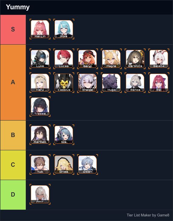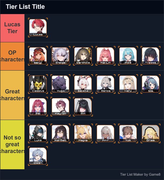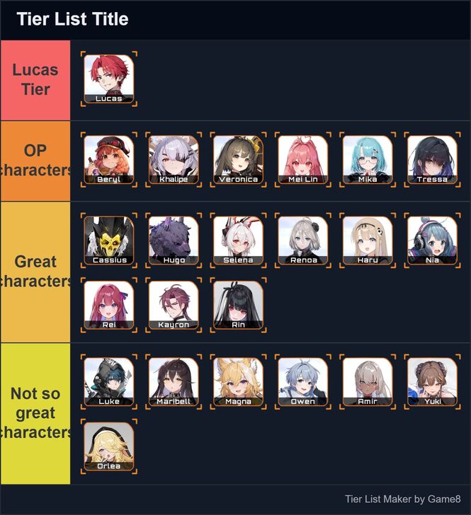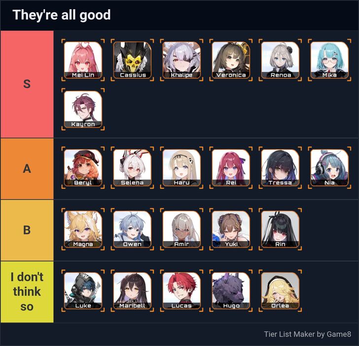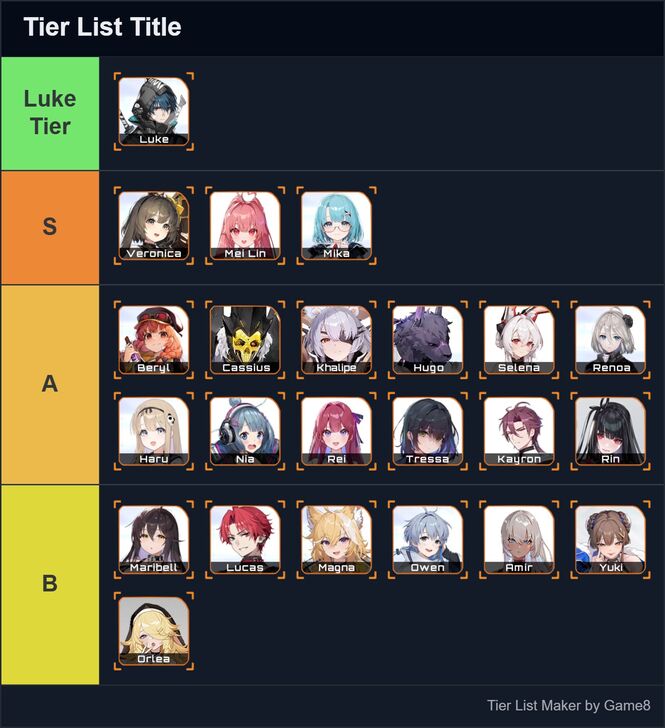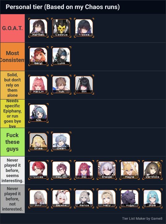 OKAY, this is the end, no more tierlist cuzzz new unit soon, Mei Lin too op with veronica, prob they should have their own tier at the top, Mei Lin does like 5x more damage than any other DPS in the game, Veronica best card draw, Tressa really strong even without Hugo, Khalipe is god for Chaos. Yuki and Luke are on par, and Orlea is cheeks.