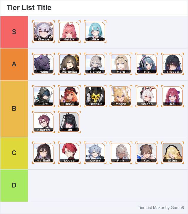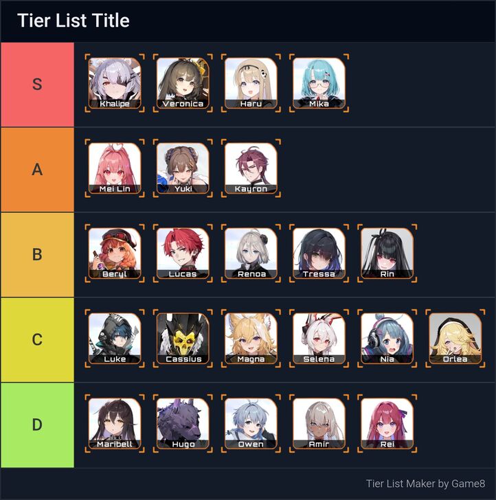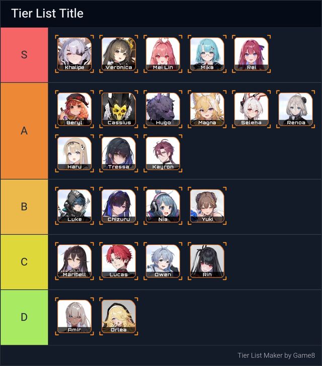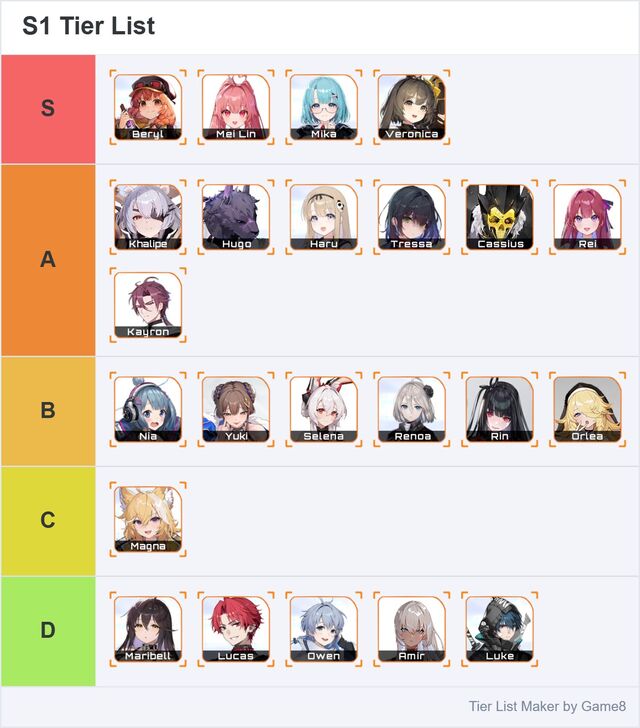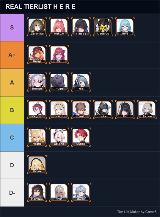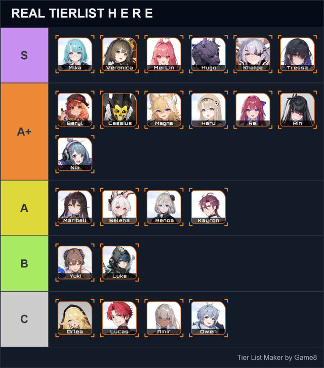 OKAY! GAME WENT TO H3LL...Mei Lin, Veronica, Tressa, Cassius, unmatched nothing compares to this right now, Beryl and Rei are amazing if you have Rei E6 SHE'S DEFINITELY S TOO! Khalipe useless beside Chaos, I think she will keep droppin', Hugo is great but Tressa is just broken and her team is so much better with Cas and Mika for heal daggies. Chizuru should be around Yuki on B or something, Luke can be good with some setup but still could go higher, I think maybe to A.