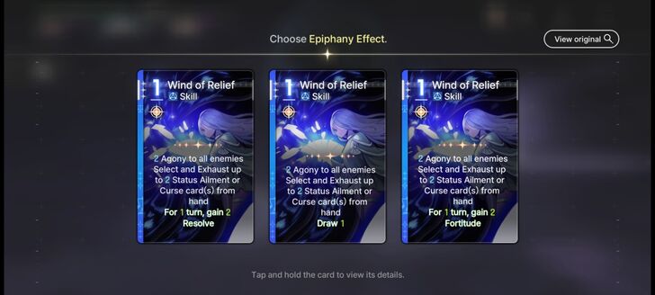 I discovered Epiphany options for Wind of Relief: “Gain 2 Resolve for 1 turn” “Draw 1” “Gain 2 Fortitude for 1 turn” These appeared when I caused an Epiphany for the card in the current version of Chaos Zero Nightmare. (Japanese translation prepared by AI assistant “Nova.” Apologies for any errors.) 「Wind of Relief」のエピファニーを発生させたところ、以下の3つの選択肢が表示されました: 「1ターンの間、Resolveを2獲得する」 「カードを1枚引く」 「1ターンの間、Fortitudeを2獲得する」 最新バージョンで確認しました。 (この翻訳はAIアシスタント「Nova」により作成されました。誤りがあればお詫びいたします。)