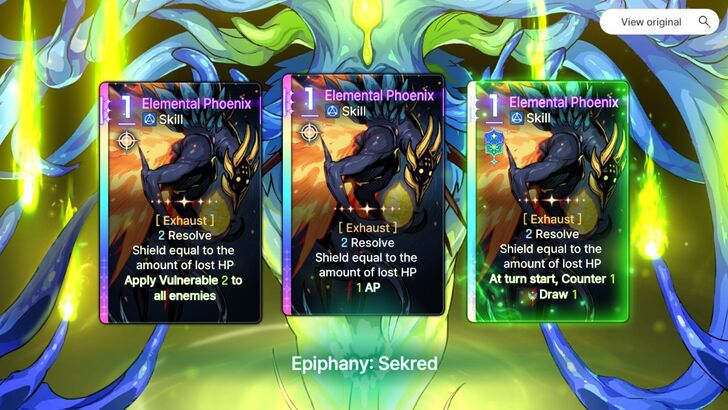 Since Epiphanies aren't listed yet and people may find it useful, here are the three I know of for Elemental Phoenix: [Exhaust] 2 Resolve Shield equal to the amount of lost HP Apply Vulnerable 2 to all enemies [Exhaust] 2 Resolve Shield equal to the amount of lost HP 1 AP [Exhaust] 2 Resolve Shield equal to the amount of lost HP At turn start, Counter 1 I also got a Sekred bonus on the last one, giving it the additional effect Draw 1