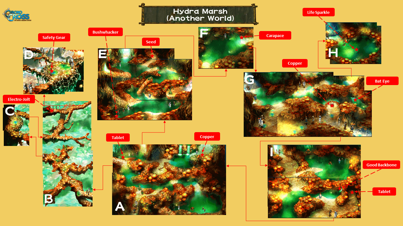 | 1 | ![]() ・Grab the Safety Gear To prepare yourself for the Hydra Marshes (whether or not you chose to help Kid), you'll need some very important equipment. Take the exit on the left when you enter, and take the stalks to the left. Begin heading upward along the branches and you'll eventually come across of group of surveyors. Talk to the man in purple to receive the Safety Gear! |