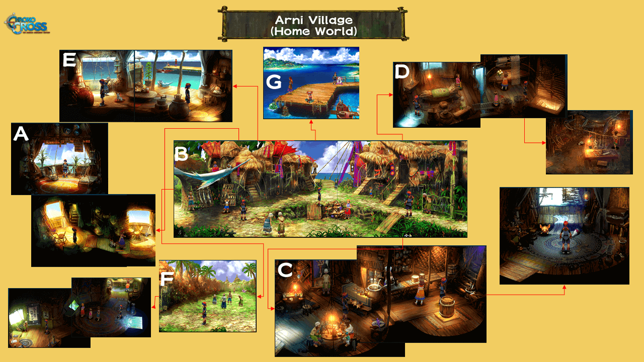| 1 | ![]() ・Speak to Marge Head into Arni Village, speaking to the villagers if you like, and find Marge, Serge's mother. She will be shocked, but what's more shocking is Radius barging into the home to fight you! |