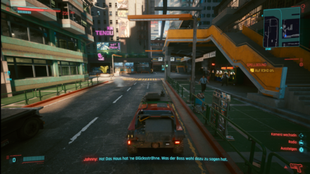 For whatever reason since i got past the biochip heist every time i load a save i get an audioclip and subtitles that say Johnny: Ha. House is rakin' it in. Wonder what the boss has to say about it The subtitles permanently stay there and if i load a new area the dialogue repeats