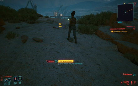 Xbox One X: During mission Queen of the Highway Panam will continually say "What's up V?" Due to the open speech prompt before entering the Basilisk tank. She will not stop saying it if you are in close proximity to her. Reloading saves does not fix it. I am about to finish the mission to see if the bug persists after its completion.