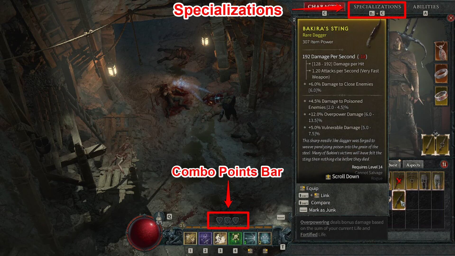 Completing this quest rewards you with the Bakira's Sting Dagger, and access to your specializations denoted by the presence of the Combo Points Bar. |
