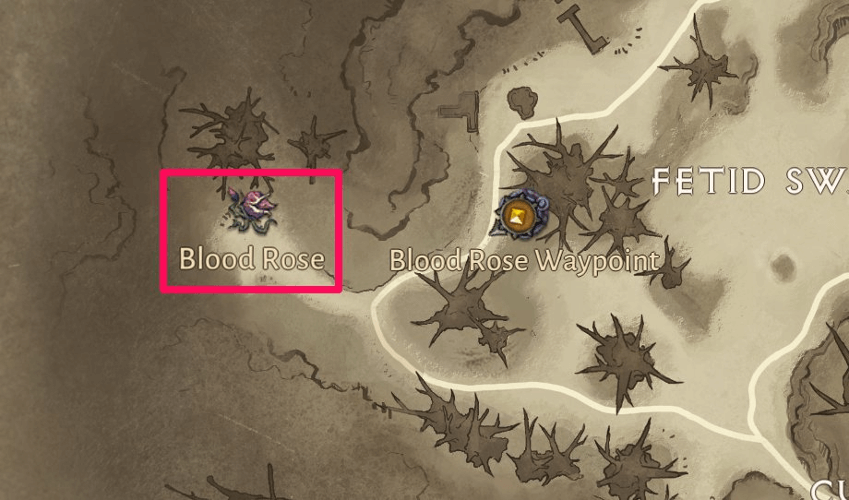 The Blood Rose spawns in its lair at the westernmost part of the Fetid Swamp in Dark Wood. When it has spawned, a colored icon of the boss will be visible on the world map.