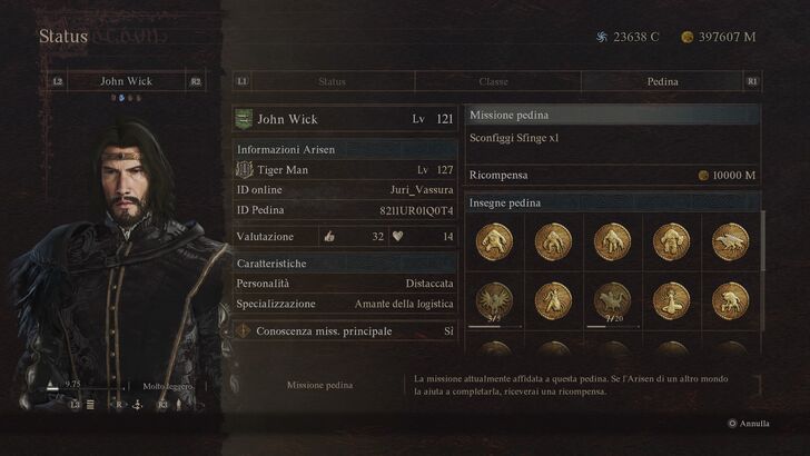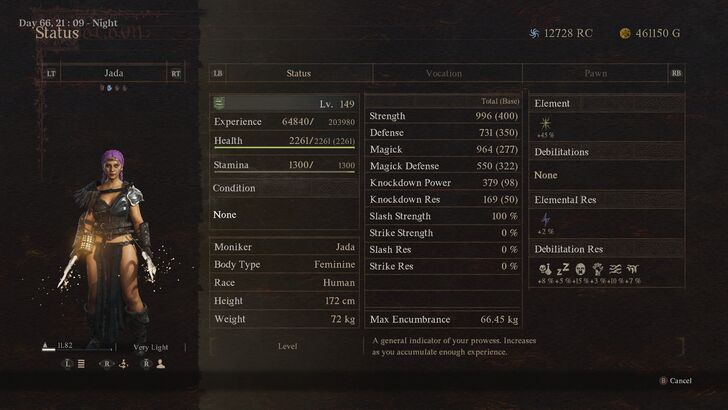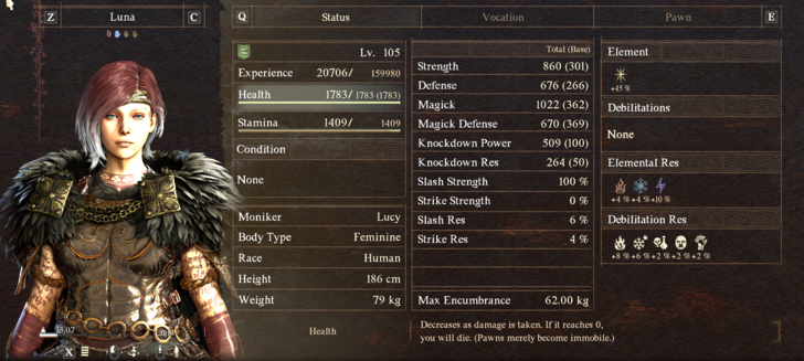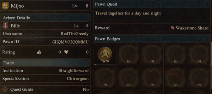 | 2 | Go to your own Pawn's Status screen. This should be the tab to the right of your Arisen with a blue hand icon. |