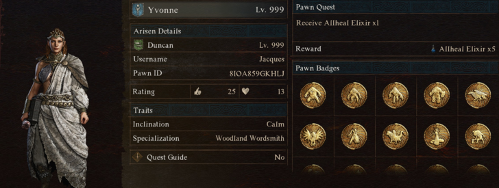 Platform: Steam Name: Yvonne Gender: Female Race: Elf Level: 999 Vocation: Mage Inclination: Calm Specialization: Woodland Wordsmith Skills: High Levin, Ice Affinity, High Halidom, High Palladium Augments: Exaltation, Radiance, Mettle, Apotropaism, Constancy, Dominance Pawn ID: 8IOA859GKHLJ Friend Code: 87873450 Pawn Quest: Receive Allheal Elixir x1, Reward: Allheal Elixir x5 Pawn Badges: All Badges Obtained Quest Guide: All Quests Completed