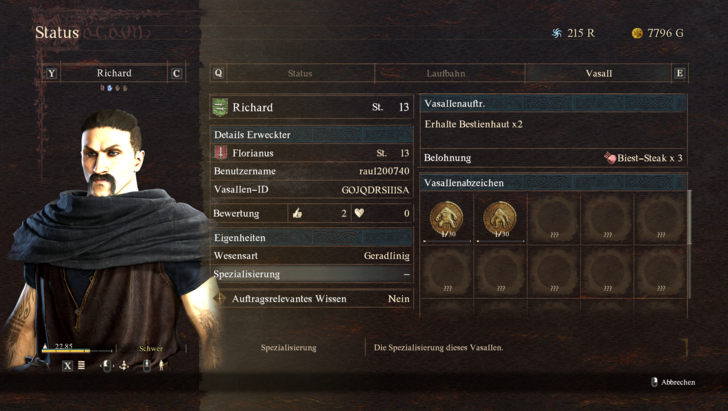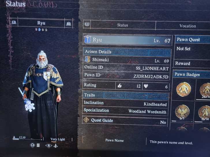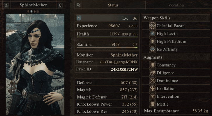 Platform: PS5 Pawn ID: QDCSA0WEWXRK Name: Arawn Level: 75 Race: Human Height: 192cm/Weight: 91Kg (Max. Encumberance 78.3kg) Vocation: Fighter Specialisation: Woodland Wordsmith Inclination: Straightforward Weapon Skills: Riotous Fury (Maister Skill), Full Moon Slash, Gutting Skewer, Cloudward Slash (handy for catching those annoying harpies!!) Augments: Mettle, Provocation, Thew, Dominance, Pertinacity, Verve Bounty of 10000G for Sphinx kill, refreshed regulary
