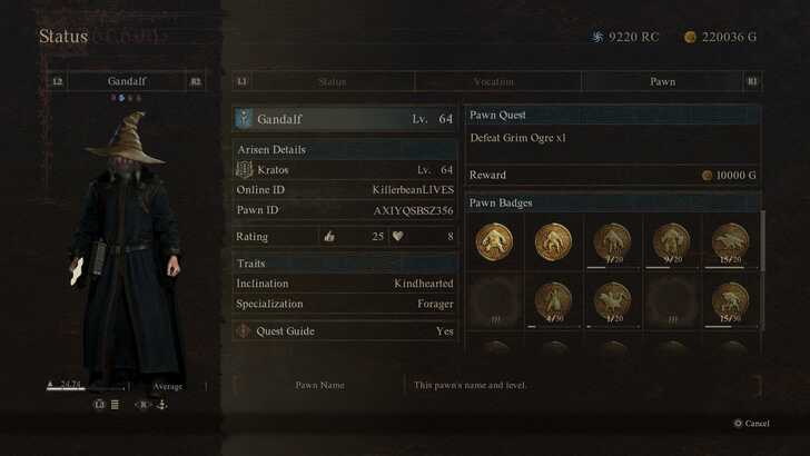 | 2 | Go to your own Pawn's Status screen. This should be the tab to the right of your Arisen with a blue hand icon. |