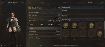 Name: Black Widow Female, Human, Calm Level: 35+ Vocation: Archer Specialization: Forager Skills: Manifold Shot, Tempest Shot, Deathly Arrow, Spiral Arrow Pawn Quest: Varies, Reward: 10000g Pawn ID: NBCW3Q8AD1VQ