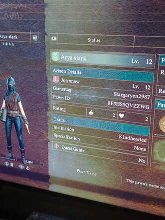 Platform: PS5 Name/Moniker: Cerise/Cherry Vocation: Mage/Sorcerer Level: 19 Inclination: Kindhearted Specialization: None (will look for logistician maybe) Pawn ID: KVIELS97ZTA2 PSN: ElemenceCerise Good healer/support for a team. Tried to make my wife as a pawn and it looks exactly like her (minus the tattoo haha that's just me wanting that). Playing constantly so she will probably level up. She will heal all your problems and be kind to you in your hours of need.