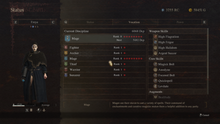 Name: Frieren Class: Sorcerer Specialization: Will make her Chiurgeon as soon as I find myself in Melve again :p Pawn ID: IRTCTLGY97Q5 She only has high salamander and augural flare to reduce random skill spam. Augural flare is her main ability, which she should focus on. Just hit that magic embedded spot at the target a lot of times and then watch that spot going boom for a lot of damage. Best to combine with somebody who spams many attacks in a short time.
