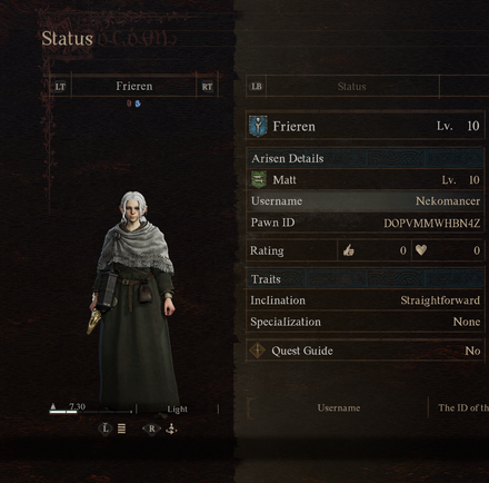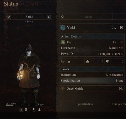 | 2 | Go to your own Pawn's Status screen. This should be the tab to the right of your Arisen with a blue hand icon. |