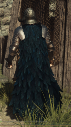 Guero Peafowl Feathercloak (22500g) Bought from merchant Ines (Met her in Harve Village). 3% Ice and Lightening resist, 3% frost debilitation res. "A cloak fashioned from the feathers of a peafowl native to the Guerco Mountain Range. The cascade of dark azure plumage is majestic to behold." Its a full-length cloak of dark blue feathers.