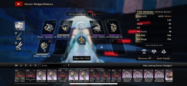 Honesty, the Build is a bit scuffed because its assuming you are able to kill them(While this true for anything early game, you cant rely on sanity gain) I would reccomend the one shotgun that increases skill duration and the one demon wedge that gives like +40% skill duration for the price of 60% skill range. You really dont need much skill range, and once you get misty veil the range just increases by itself. For now, ive been running tripple blaze inspo with the duration wedge I talk about
