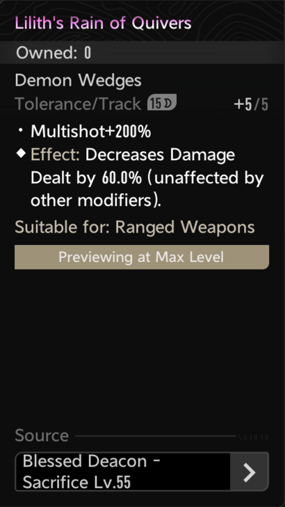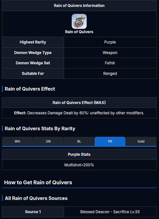 Wrong name, should be Lilith's Rain of Quivers. Wrong image, should look like a Lilith wedge. Wrong demon wedge set, should be Lilith. Correct effect except, There is only one rarity(Purple) of this wedge so the Lilith's Rain of Quivers Stats by Rarity could be removed, however you could simply remove the WH, GN, and BL rarities. Within the Lilith's Rain of Quivers Stats by Rarity you could add -Decreases Damage Dealt by 60%: unaffected by other modifiers-, AND +200% multishot.