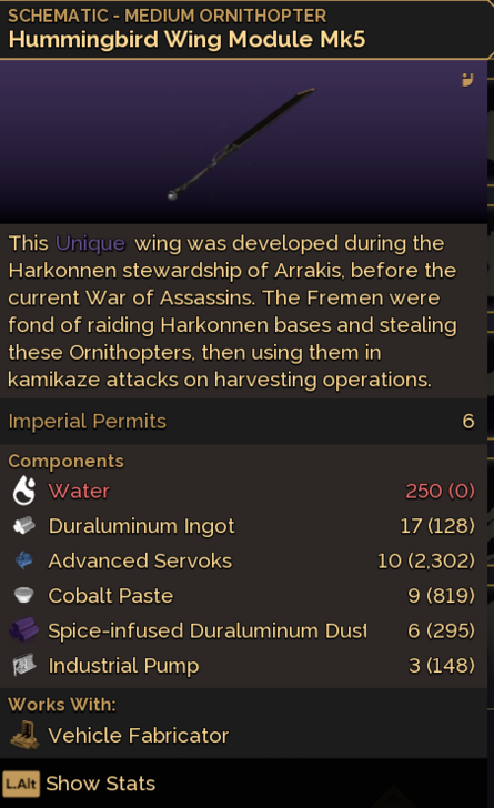 Found a Humming Bird Wing Module schematic for the Assault Thopter Mk5 at a Imperial Testing Station in the Deep Desert, IIRC the testing station around A-7, A-8. 1,250 armor per wing, glide speed of 150 kmh, turn rating of 6, agility rating 4, strafe type wings, and the schematic permits a full set of 6 wings to be made, fortunately.