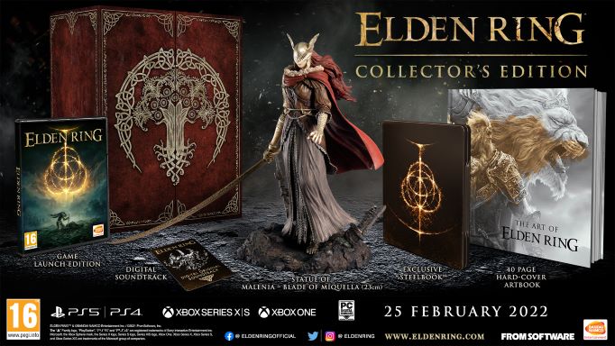 The Elden Ring: Collector's Edition includes the physical copy of the game, or the game code for PC, the Malenia - Blade of Miquella Statue, a steelbook, art book, game poster, art cards, and woven patches.