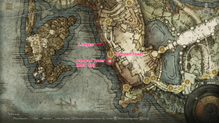 This Crucible Knight is located at the bottom of the Rampart Tower's main lift in Stormveil Castle. To locate this hidden Crucible Knight you must first jump from a series of ledges starting on the bomb-throwing bird area, north of the Rampart Tower's site of grace.
