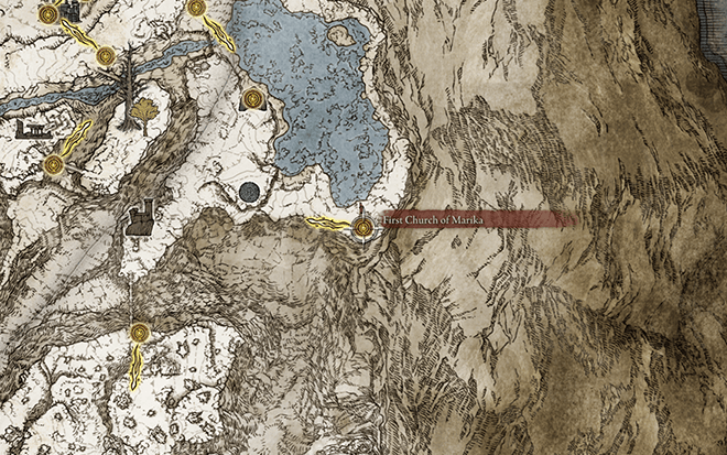 From the Freezing Lake Site of Grace, head south along the western edge of the lake to find the First Church of Marika at the southern end.