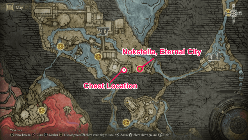 From the Nokstella, Eternal CIty site of grace, take the stairs to the west and then turn left once you reach the first landing. The room where the Ant's Skull Plate is will be guarded by a Nox Swordstress that wields a Nox Flowing Sword. Defeat the swordstress and then open the chest near her to obtain the Ant's Skull Plate shield.