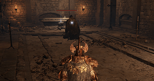 Head inside, and you should be able to see the Bloodhound Knight guarding a corpse that contains the Gelmir Knight set. Defeat it and pick up the equipment on its corpse to get the equipment.