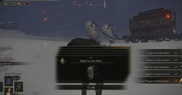 Night's Cavalry set can be obtained by defeating the Night Cavalry duo at the Consecrated Snowfield located in the Mountaintops of the Giants.