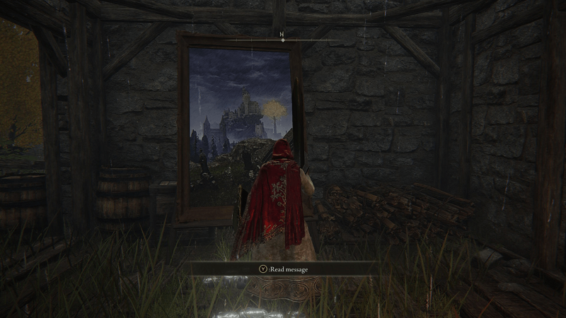 The area portrayed inside the painting is located southeast of Behind Caria Manor Site of Grace. Interact with the spirit to receive the rewards.