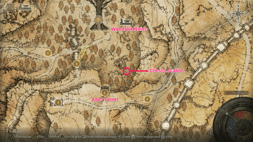 The chest that contains the Wrath of Gold incantation is located underneath the southern section of the Woodfolk Ruins of the Altus Plateau region. Be wary of the Wormface monsters that guard the entrance to the chest.