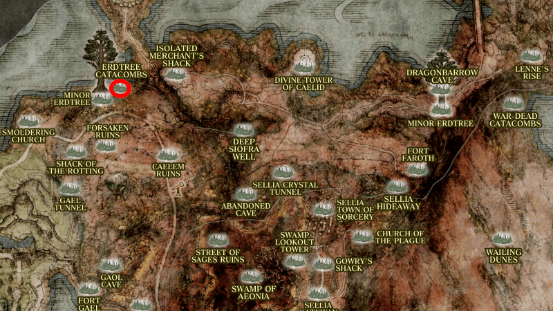 | Location | Upon reaching Smoldering Church, take the left fork in the road to a downward slope that will lead you to the Minor Erdtree. The Minor Erdtree Catacombs are right next to it. |