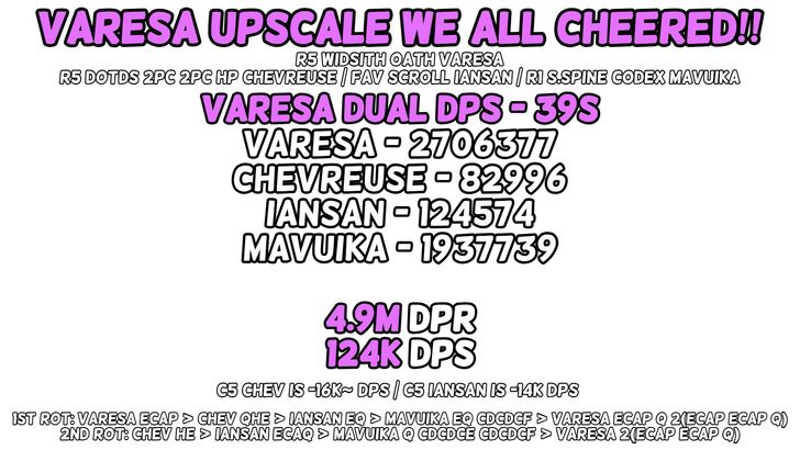So this claims a stable DPS using The Widsith, a weapon that provides 1 of 3 buffs randomly every 30 seconds. With a 39s rotation a weapon with 30s cooldown means roughly 1 in 3 rotations will line up and the other 2 will lose DPS. Also loses 30k DPS if Chevreuse and Iansan aren't C6 and requires you use Mavuika who can do better in her own teams. I like Varesa but I don't think that build justifies SS.