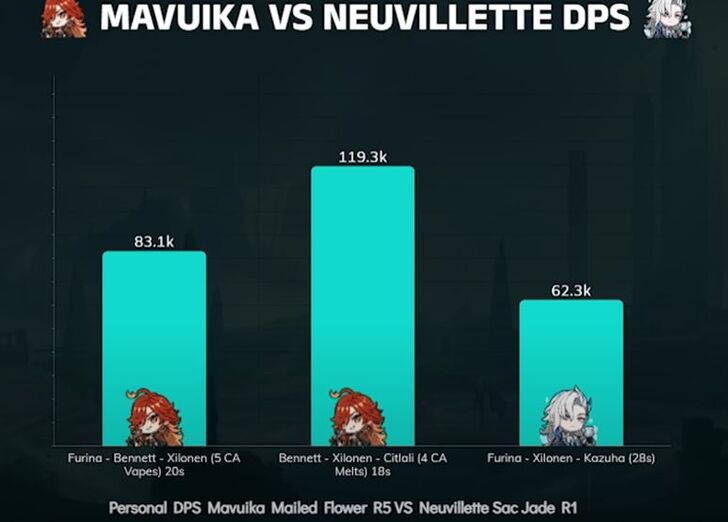 hahaha good joke, name one CC/TC who thinks she is not the highest ceiling lmao, even zajef who is a neuv glazer thinks Mavuika's damage is the highest ceiling right now but sure. For reference here is Mavuika's DPS is at 119k, whereas this is Neuv's, this is personal damage, if we assume its team damage then Neuv reaches 95k DPS, still significantly worst than Mav btw, and this is Neuv's premium team of full 5 star. And still loses bark more loser