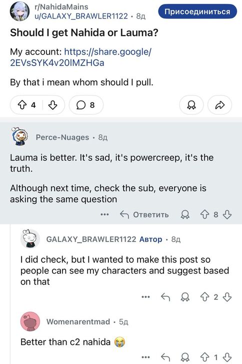 What? Why are you replying to me, I didn’t mention Nahida? And no, it makes perfect sense, Lauma replaces her in 90% of teams and finally makes dendro meta