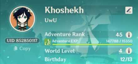 Server: America UID: 646347576 Adventure Rank: 55 Looking for Co-op and Serenitea Pot friends :)