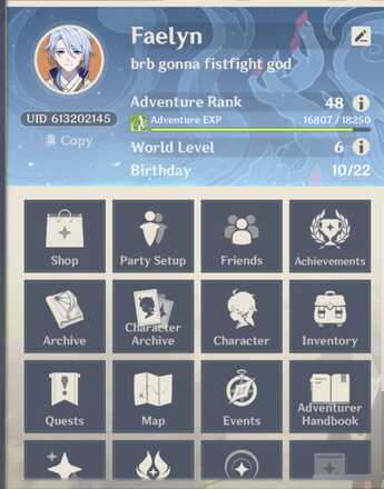 UID: 826580937 (Asia server) AR: 58 IGN: Jon Feel free to add if you need to farm mats, fish, or need help for anything in general. If you do add me, please reply with your IGN or something so I know who you are. Cheers!