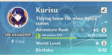 Server: Europe UID: 741283364 User: Nina AR 34 sort of new to the game (I played for about 2 weeks). I'm just a casual player so add me if you want to chill in my world, do some bosses/domains or whatever else. <3 Discord: nina_l#2129