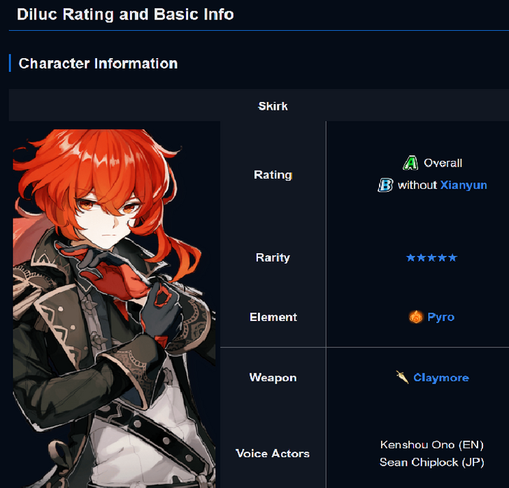Honestly, Diluc should drop a tier. his DPS is meh, and he relies heavily on other characters to even compete with other A tiers like Ayato or wanderer. It sucks and it hurts as he was my first 5 star, but like, Yoimiya is a better main DPS than he is. Diluc is only better than Yoimiya with specific characters like xianyun, which a lot of people reading this wiki might not even have. So its disingenuous to put him at A rank when he only achieves that through OTHER characters.