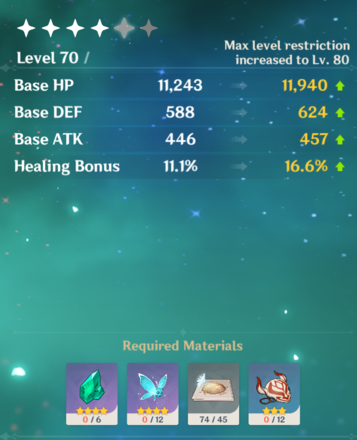 For the lvl 80 ascension you need: 6x Vayuda Turquoise Chunk 12x Hurricane Seed 45x Dandelion Seed 12x Ominous Mask
